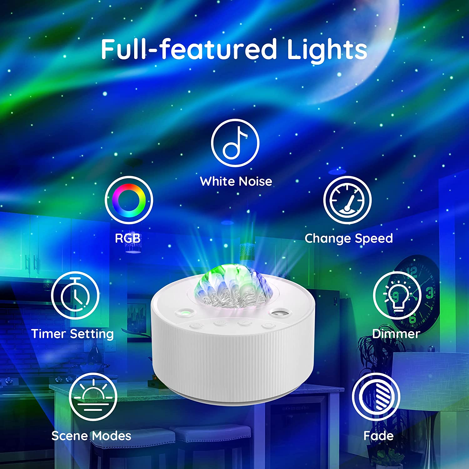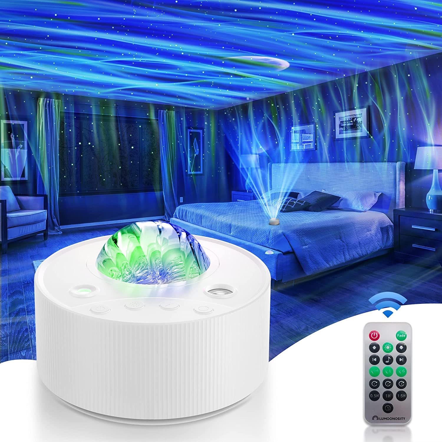 - Proyector Aurora de Northern Light's: este proyector de estrellas puede mostrar estrellas, luna y luces aurora en una variedad de ajustes diferentes. Estrellas/Luna/Aurora se pueden utilizar juntas e independientemente. Y también hay 5 sonidos blancos integrados para ayudarte a dormir fácilmente.